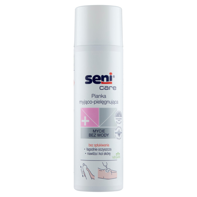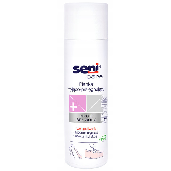 Pianka myjąco-pielęgnująca Seni Care to delikatny, skuteczny preparat do codziennej higieny skóry, który umożliwia jej oczyszczenie bez konieczności spłukiwania wodą. Doskonale sprawdza się w opiece nad osobami leżącymi, chorymi oraz pieluchowanymi – zwłaszcza podczas higieny okolic intymnych.