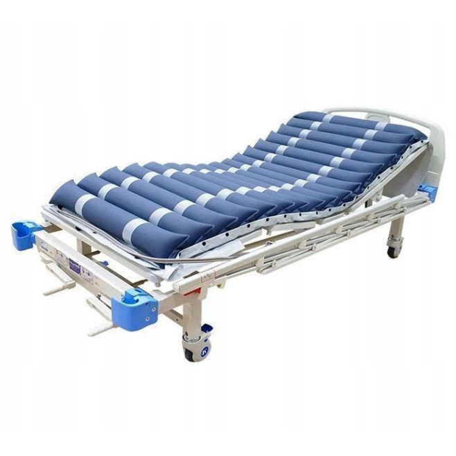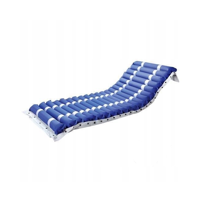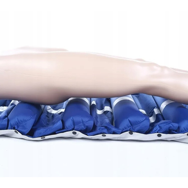 Materac przeciwodleżynowy pneumatyczny rurowy w zestawie wraz z wydajną pompą zmiennociśnieniową z regulacją ciśnienia dla pacjentów o maksymalnej wadze 150 kg.