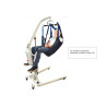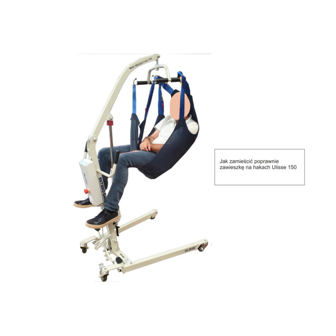 Zawsze ustaw urządzenie stabilnie, zablokuj hamulce podczas transferu i upewnij się, że podwieszka jest prawidłowo założona oraz zaczepiona. Nie przekraczaj udźwigu 150 kg i stosuj urządzenie zgodnie z instrukcją użytkowania.