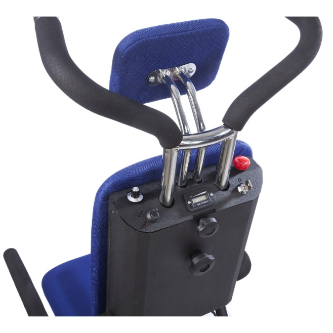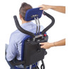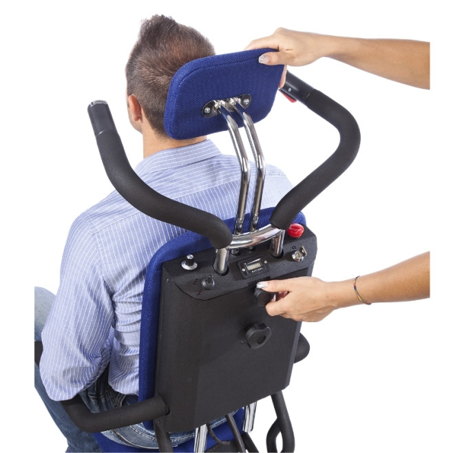 Schodołaz ma elementy, które wspierają komfort i bezpieczeństwo: pas zabezpieczający, regulowany podnóżek i zagłówek oraz uchylne podłokietniki. Dodatkowe tylne koło podporowe pozwala „zatrzymać się” na stopniu, odpocząć lub poprawić pozycję pasażera bez ciągłego balansowania sprzętem.